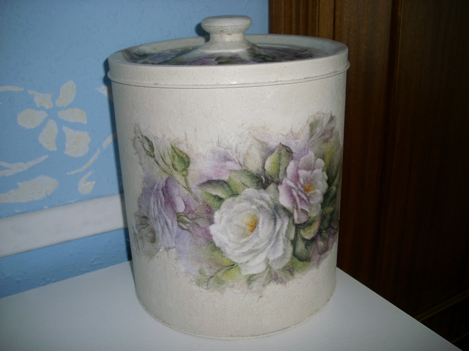 Esta lechera lleva una imprimación para metales, técnica de la vela y pintada en color mantequilla, después le puse papel de arroz con rosas amarillas y barniz.